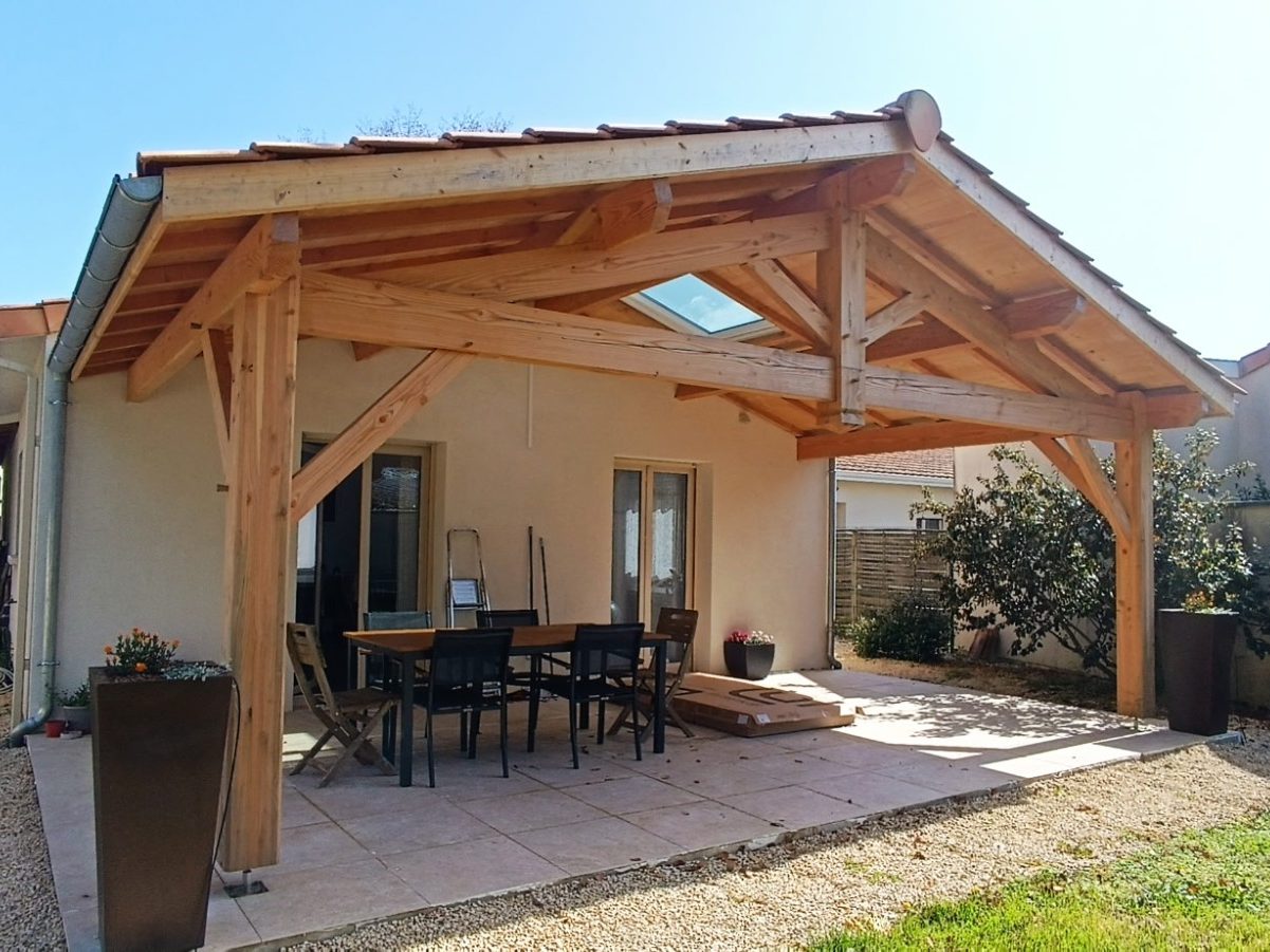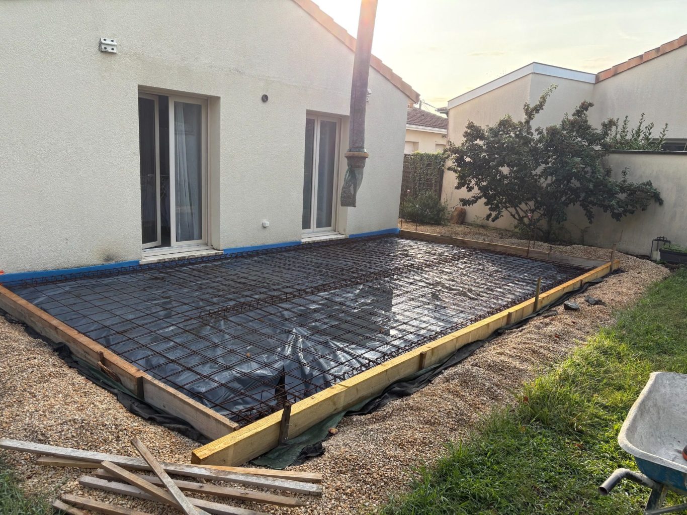 Réalisation d’une dalle béton pour terrasse, comprenant le terrassement, le coffrage, le ferraillage, le coulage du béton et l'intégration de fondations pour recevoir la charpente.