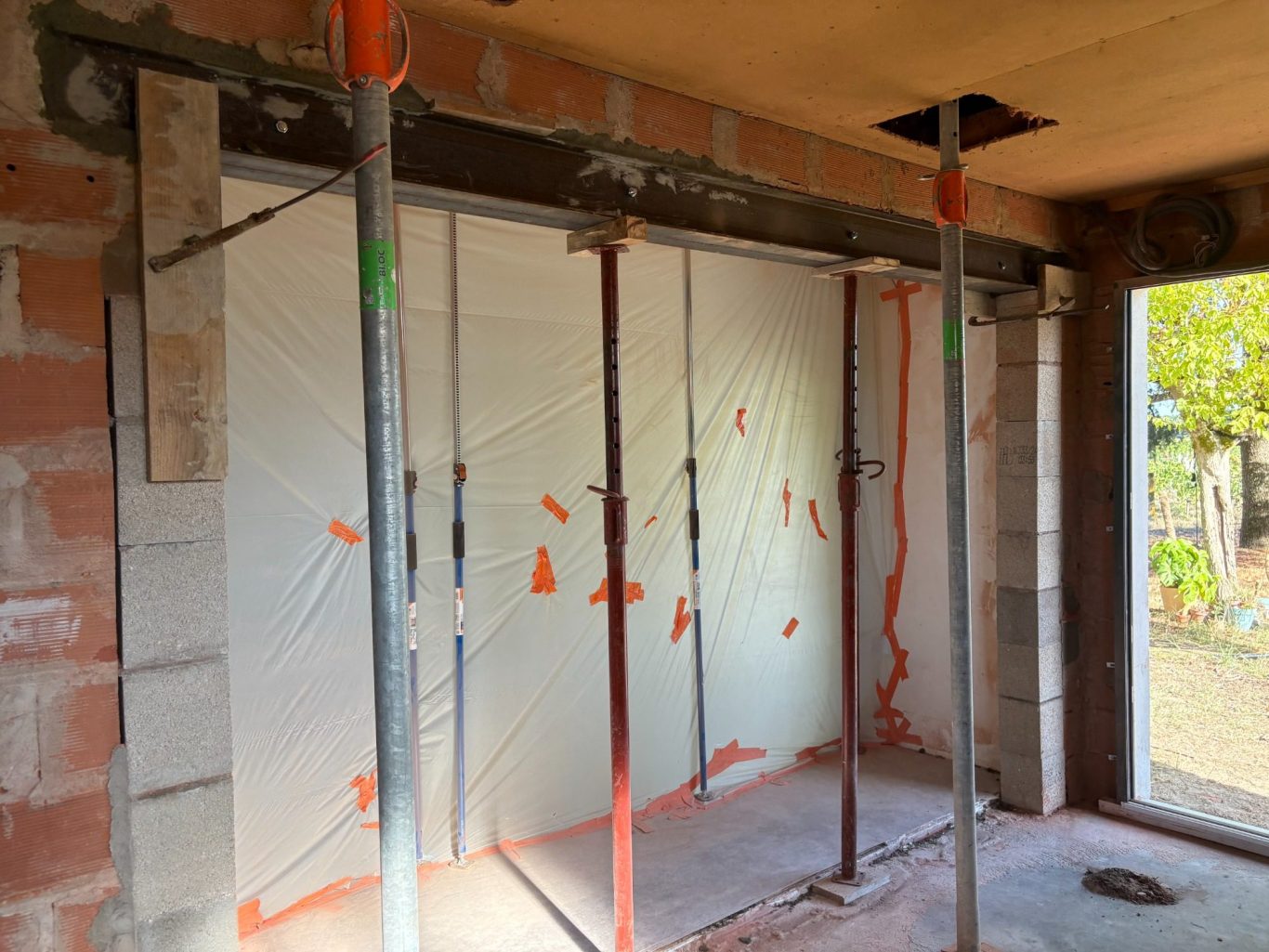 Nous mettons en place un IPN (poutrelle en acier) ou une poutre en béton armé, calculée selon les charges reprises. La poutre est scellée dans les refends, puis les étais sont retirés progressivement après séchage complet.
