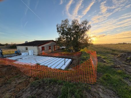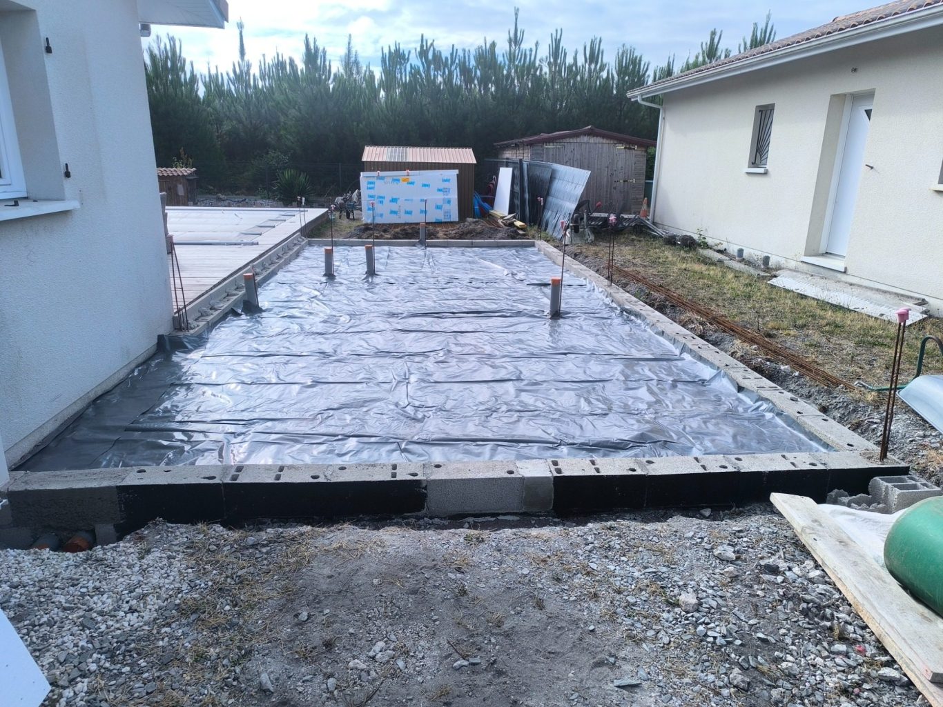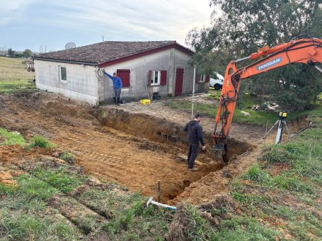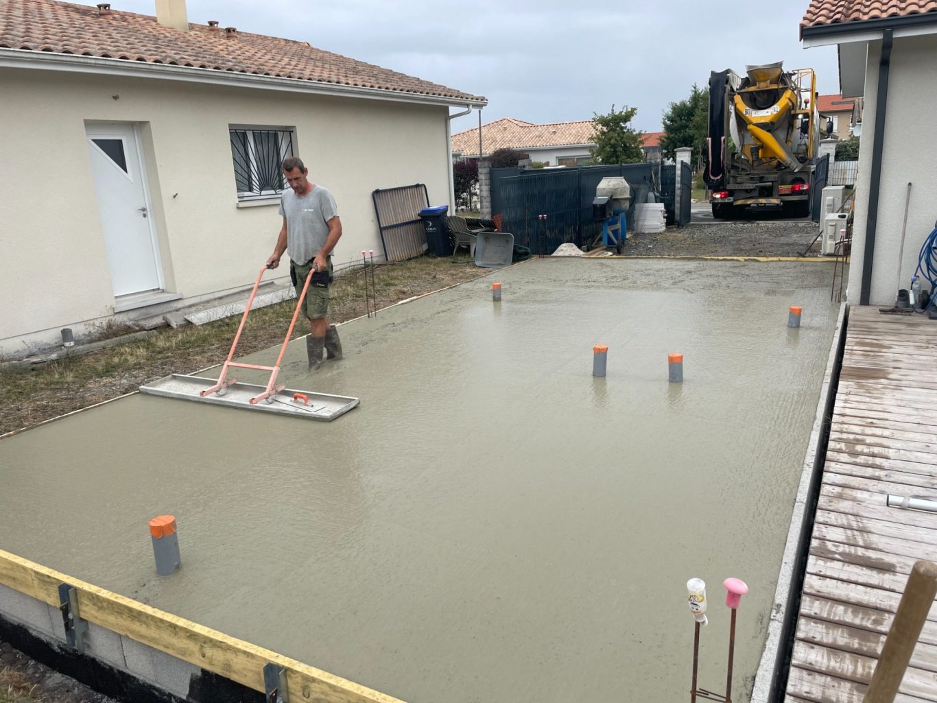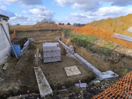 Réalisation d’une extension de maison avec travaux de démolition et réhabilitation, incluant les fondations, la dalle béton et l’élévation des murs.